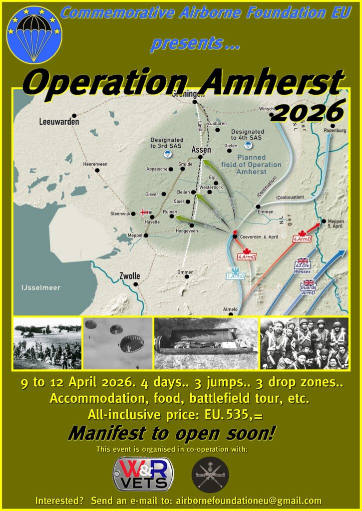 Van 9 april t/m 12 april 2026 vindt de herdenking plaats van Operation Amherst, met o.a. drie paradroppings op drie verschillende plaatsen in Drenthe. Daar zal o.m. ook de Cessna 208B Grand Caravan PH-JMP van Skydive Hoogeveen aan deelnemen.